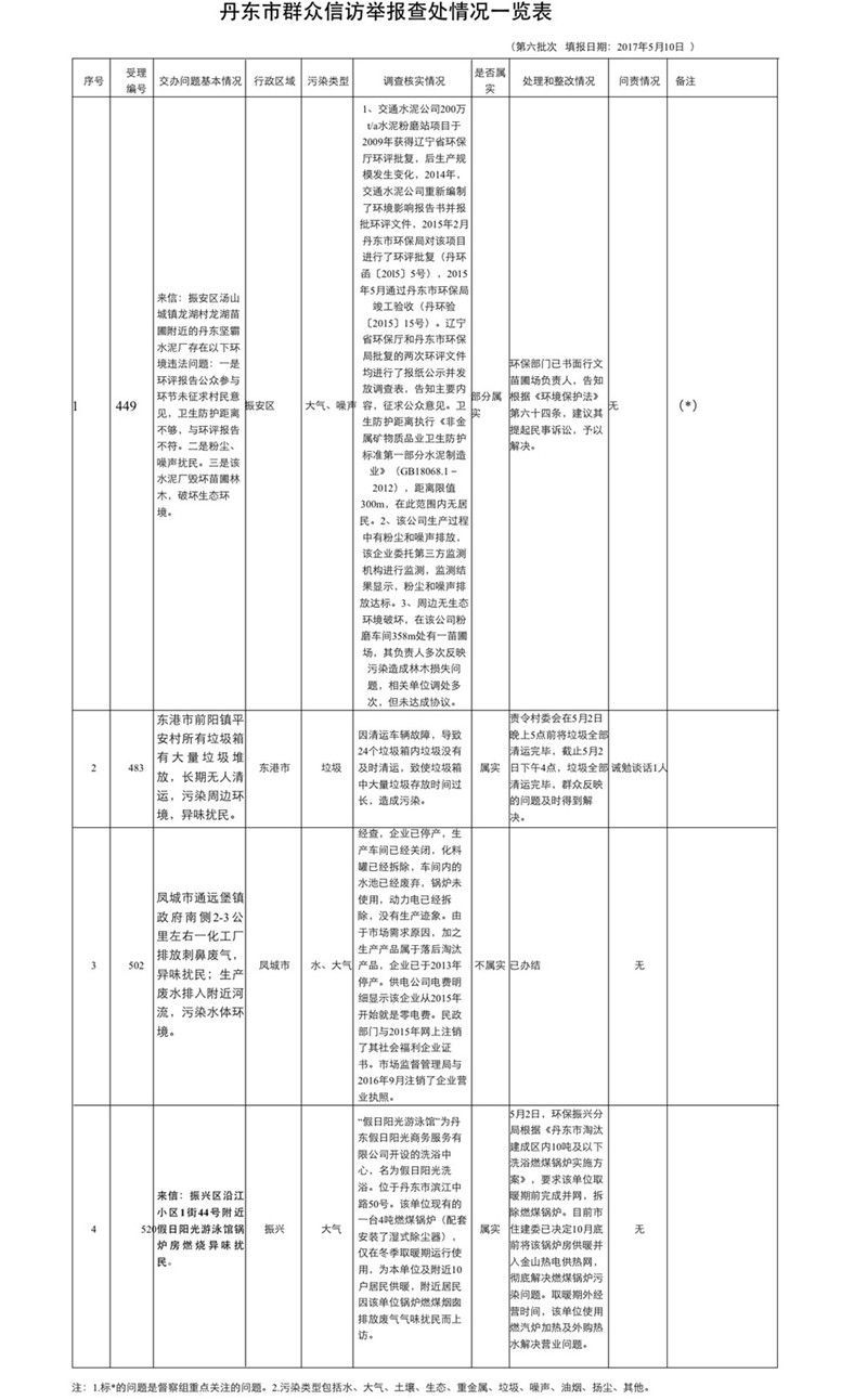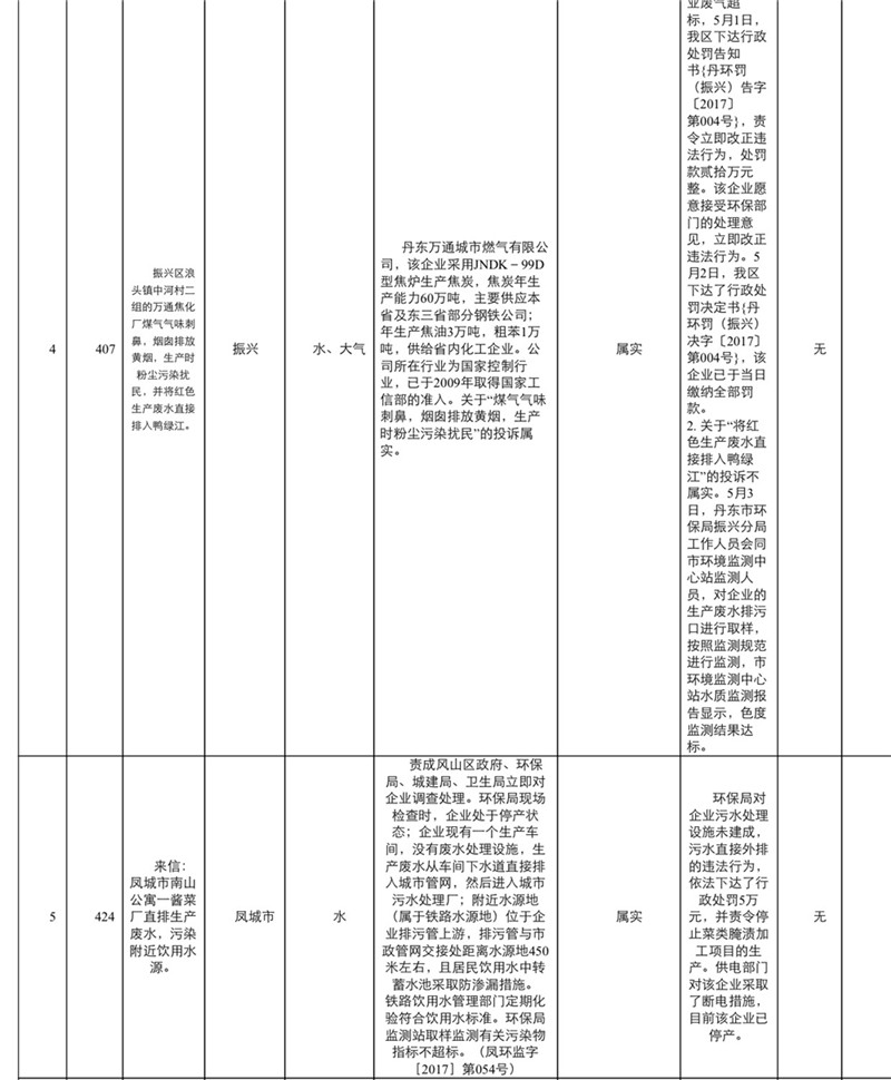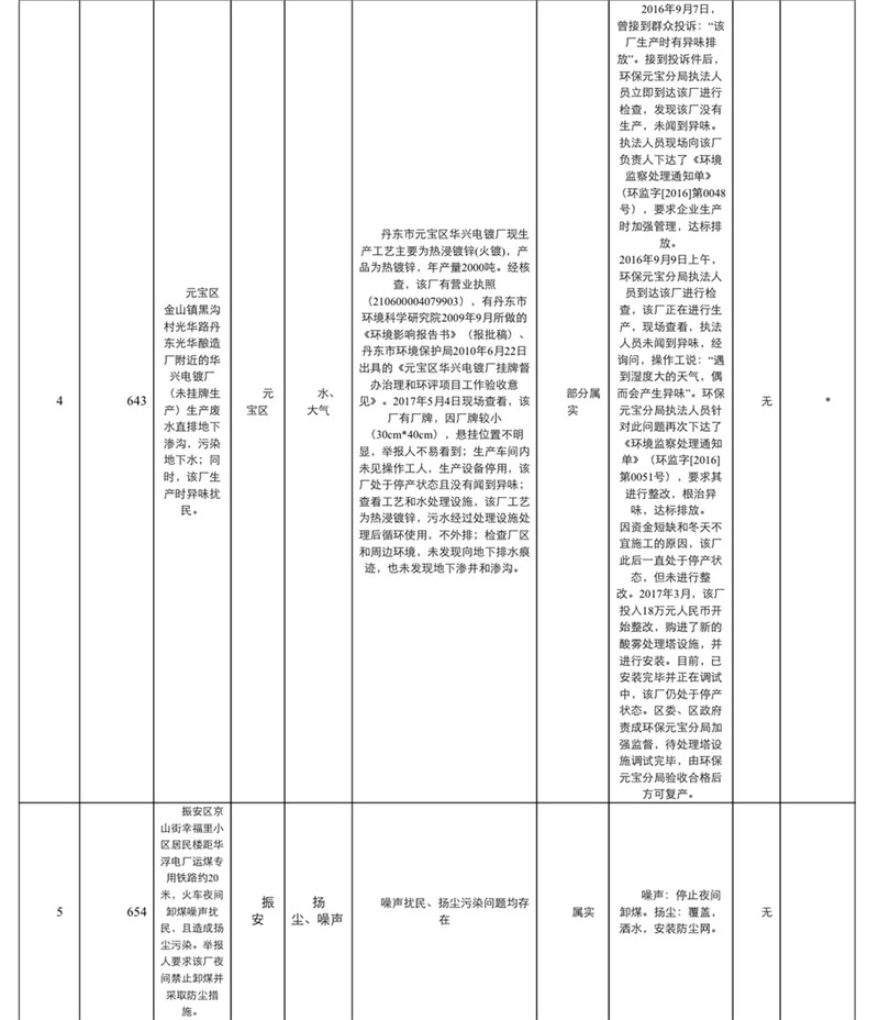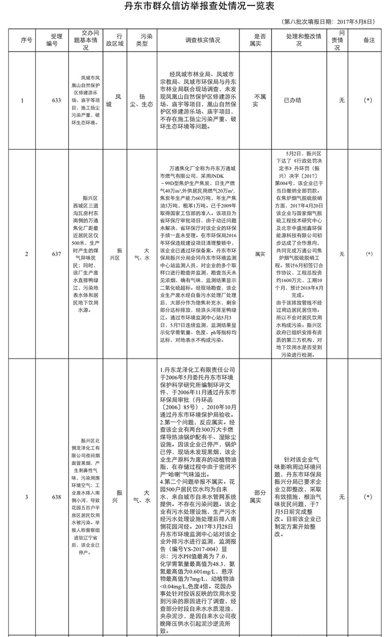 中央环境保护督察丹东市信访投诉问题办理情况通报